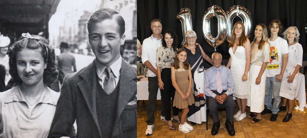 Brian with Rose on their engagement; Brian with his immediate family at his 100th birthday celebrations. Photo credit from 100th birthday party: https://www.gmphotographics.com.au/